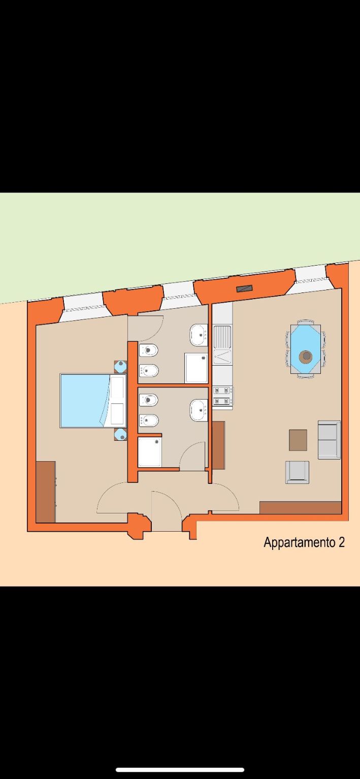 Soggiorno angolo cottura, due bagni e camera da letto.